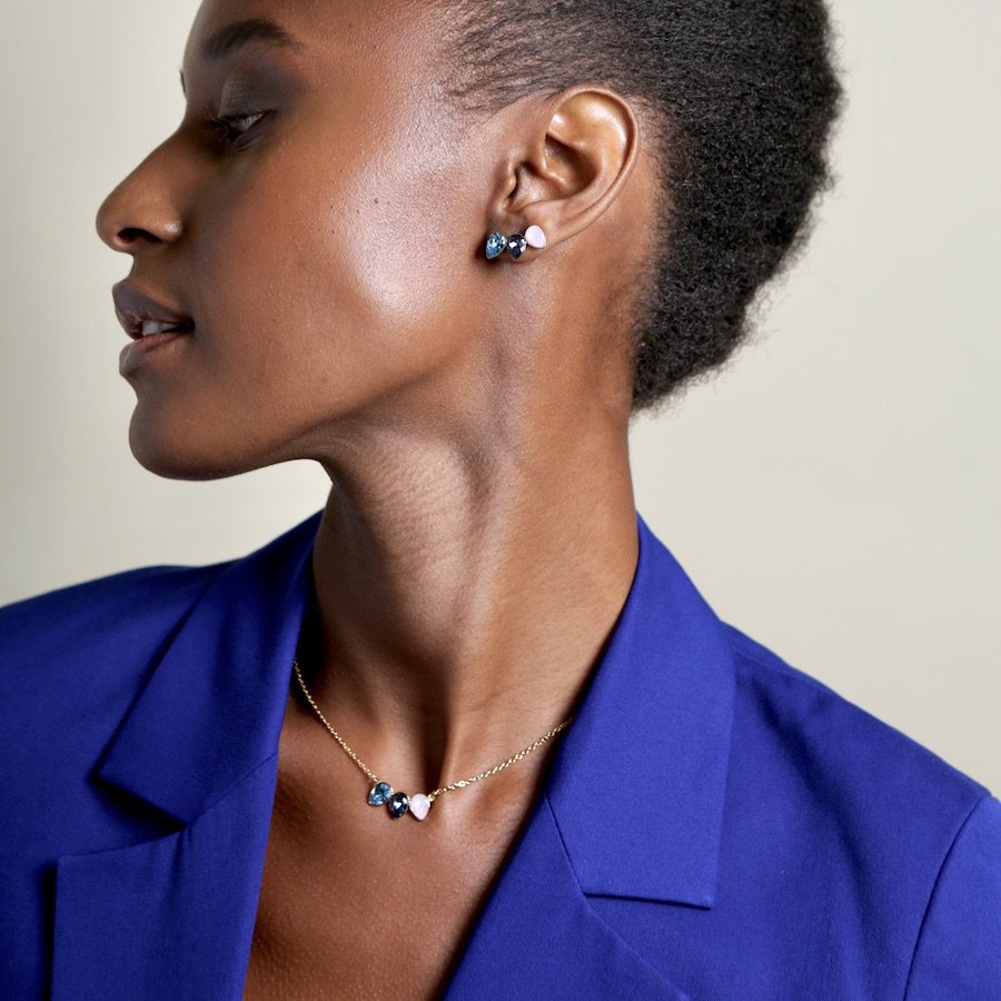 Möchten Sie Ihrem Look einen dezenten Glanz verleihen? Diese goldene Halskette ist mit 3 kleinen Kristalltropfen in Hellblau, Blau und Rosa besetzt und mit einem 24 ct. Überzug.
