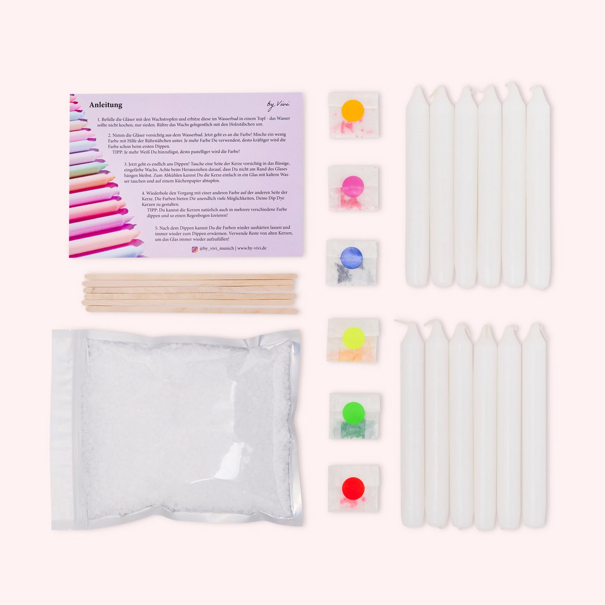 Jetzt kannst Du unsere Dip Dye Kerzen endlich auch daheim selbst gestalten mit unserem Do it Yourself-Kit, das fast alles beinhaltet, was Du zum Kerzen Dippen benötigt! Du findest in Deiner Box: 12 Kerzen à 180x22mm 500g Wachspastillen zum Einschmelzen um zu Dippen 6 Farben: Neon Edition: Neongelb, Neonrosa, Neonorange, Neonblau, Neongrün, Neonrot Stäbchen zum Umrühren Anleitung auf Deutsch und Englisch Was Du zusätzlich benötigst: Alte Gläser wie z. B. Marmeladen- oder Smoothiegläser, in denen Du das Wachs erhitzt Einen Topf und Wasser Gute Laune, um Dein Leben in Farbe zu dippen! Designed and assembled with Love in Munich. Menge 1 = DIY Box mit 12 Kerzen Farben: Neongelb, Neonrosa, Neonorange, Neonblau, Neongrün, Neonrot Brenndauer: pro Kerze ca. 6 Stunden Artikelnummer: DIY5 Bitte achte immer darauf Kerzen nie unbeaufsichtigt brennen zu lassen! Lieferzeit 3-6 Werktage. Die Bestellmenge für Händler ist 1 Stück = 1 Verpackungseinheit (4 Boxen). © Design by Vivi.